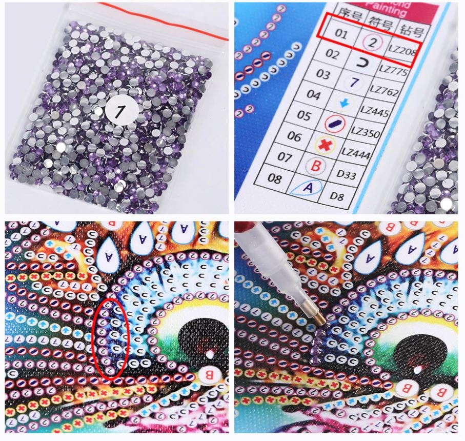 Bij diamond painting heb je een startcanvas met de afbeelding die jij gekozen hebt. Dit startblad heeft een beschermlaag die je niet direct in zijn geheel verwijderd, maar stukje voor stukje lostrekt zodat de lijmlaag open komt te liggen. Je begint het beste in de linkerbovenhoek. Je ziet de afbeelding onder de lijmlaag afgebeeld met hierin kleurcodes, deze kleurcode vertelt jij welk kleurtje steentje op die plek neergelegd moet worden. Met je speciale diamond painting pen/pincet/tool kun je een steentje oppakken uit het schudbakje, je doopt de pen eerst even in de wax waardoor het steentje blijft plakken aan je legtool. Hierna plaats je het steentje op de afbeelding. Zo werk je de hele diamond painting af en heb jij aan het einde een waar kunstwerk gecreeerd!
